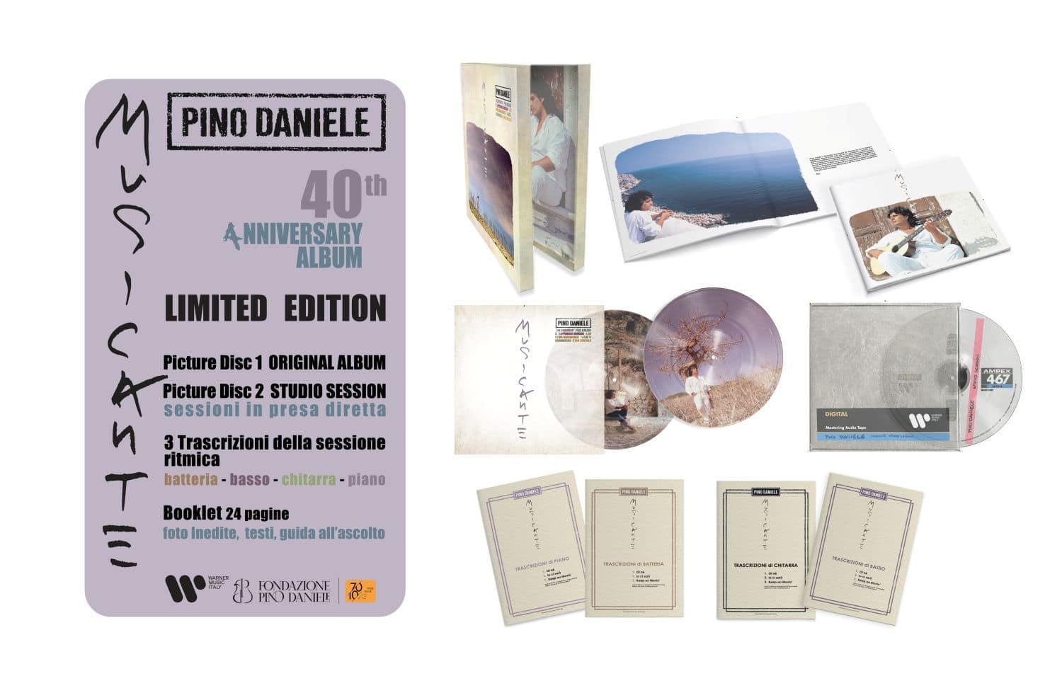 “Musicante” ha segnato un punto di svolta nella carriera di Pino Daniele: questo album del 1984, infatti, rappresenta l’opera che ha reso Pino Daniele uno dei più grandi innovatori della musica italiana. La sua capacità di fondere mondi diversi e di comunicare sentimenti attraverso un linguaggio musicale universale che unisce perfettamente italiano, napoletano e inglese, lo consacra come un “musicante” libero che sa sempre dove dirigere la propria musica, con una profondità e una consapevolezza che lo hanno reso unico nella storia della musica.Il lavoro di masterizzazione ha permesso di donare nuova vita sonora a brani incisi più 40 anni fa e di migliorarne il suono, senza stravolgerne l’essenza.“Studio Session” rappresenta un prezioso documento, che offre uno sguardo approfondito sul metodo di lavoro di Pino Daniele e sulla ricerca musicale, permettendo a chi lo ascolta di fare un viaggio nel cuore del processo creativo e di apprendere la cura e la precisione che l’artista aveva nella costruzione e nella scelta degli arrangiamenti della base ritmica, su cui poi venivano aggiunte le voci, gli assoli di chitarra e gli altri strumenti,apprezzando così il lavoro di ricerca dell’equilibrio perfetto tra basso, batteria, pianoforte e chitarra, gli elementi alla base del suo “sound mediterraneo”.“MUSICANTE 40th ANNIVERSARY ALBUM” sarà disponibile in digitale, in doppio cd e in doppio vinile limited edition.La versione CD comprende le tracce contenute “MUSICANTE ORIGINAL ALBUM” (disco 1), “STUDIO SESSION” (disco 2) e un booklet impreziosito da foto inedite.Il box limited edition, oltre al vinile dell’album originale e al vinile di “Studio Session” (entrambi picture disc), contiene ancheun booklet di 24 pagine con foto inedite, testi e guida all’ascolto e 4 inserti con le trascrizioni per chitarra, basso, batteria e pianoforte di 3 brani, che consentono a musicisti di ogni livello di approfondire e studiare le parti originali. Questi volumi sono parte di un ampio progetto della Fondazione Pino Daniele volto a catalogare e preservare l’intera opera dell’artista, con un focus particolare sull’aspetto didattico e formativo.La produzione artistica di “MUSICANTE 40th ANNIVERSARY ALBUM” è stata curata da Fabrizio Bianco per la Fondazione Pino Daniele Ets, presieduta da Alessandro Daniele.Questa la tracklist di “MUSICANTE 40th ANNIVERSARY ALBUM”: