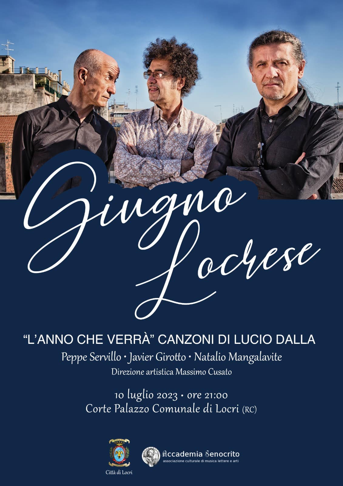 La 54esima edizione del Giugno locrese che sarà presentata da Maria Teresa D’agostino e Nicola Procopio, vedrà premiare la poesia, l’arte e la musica, inserendo la mostra “Genius Loci” con appuntamenti performativi di Amalia De Bernardis e Roberto Ghezzi, da luglio a settembre con la collaborazione dell’Accademia Senocrito e patrocinio della Città metropolitana e Regione Calabria. Serata di qualità con ospite d’onore il trio Peppe Servillo, Javier Girotto, Natalio Mangalavite, direzione artistica Massimo Cusato, con “L’anno che verrà”, un viaggio attraverso i capolavori di uno dei maestri della musica italiana di tutti i tempi, Lucio Dalla. I protagonisti sono tre personalità artistiche provenienti da culture musicali diverse, ricche e versatili che si contraddistinguono per estro e capacità interpretativa, una collaborazione pluriennale dalla quale nasce sempre un incastro musicale perfetto e la voglia di inventare insieme nuove “storie”.